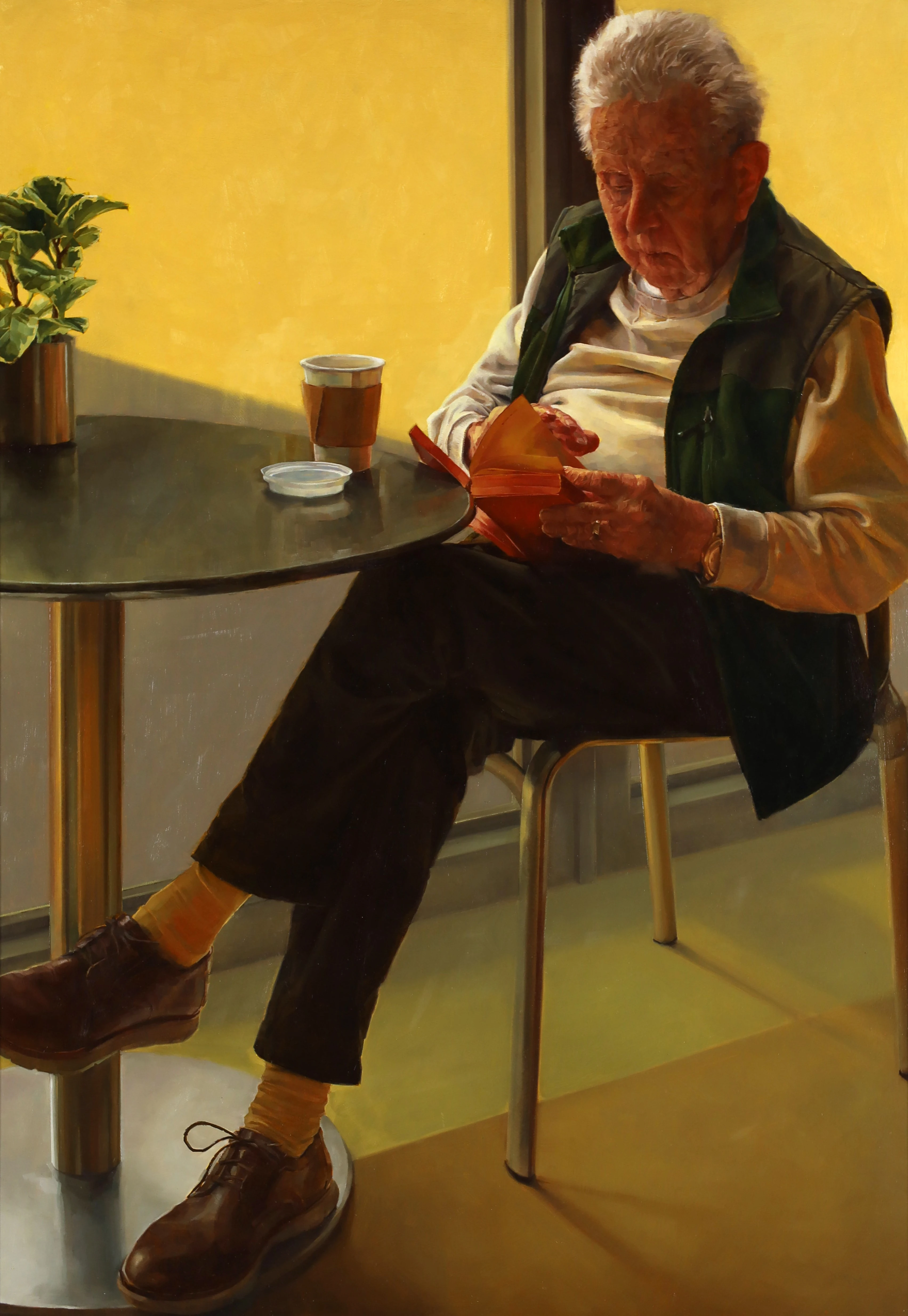 The paintings of Amy Werntz reveal an obsession with time and the everyday moments and experiences, often overlooked, that define most of our lives. The artist focuses on an older generation of people, and how their posture, clothing, and bodies reveal the stories of their lives. In depicting elder subjects, she hopes to counteract the ways in which “society has become so focused on youth as the representation of beauty and seems to have lost the reverence for age and experience,” and to challenge the viewer to confront fears of aging and an impulse to overlook our seniors as a result. Her figures inhabit shared spaces — grocery stores, bookstores, cafes, and public sidewalks — drawing attention to the experiences we hold in common and inviting us to change our perceptions of aging.