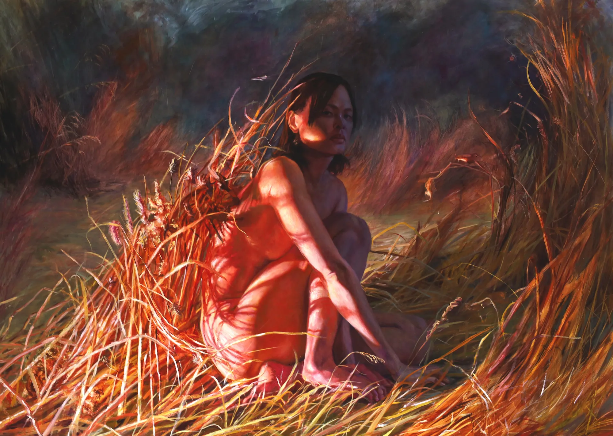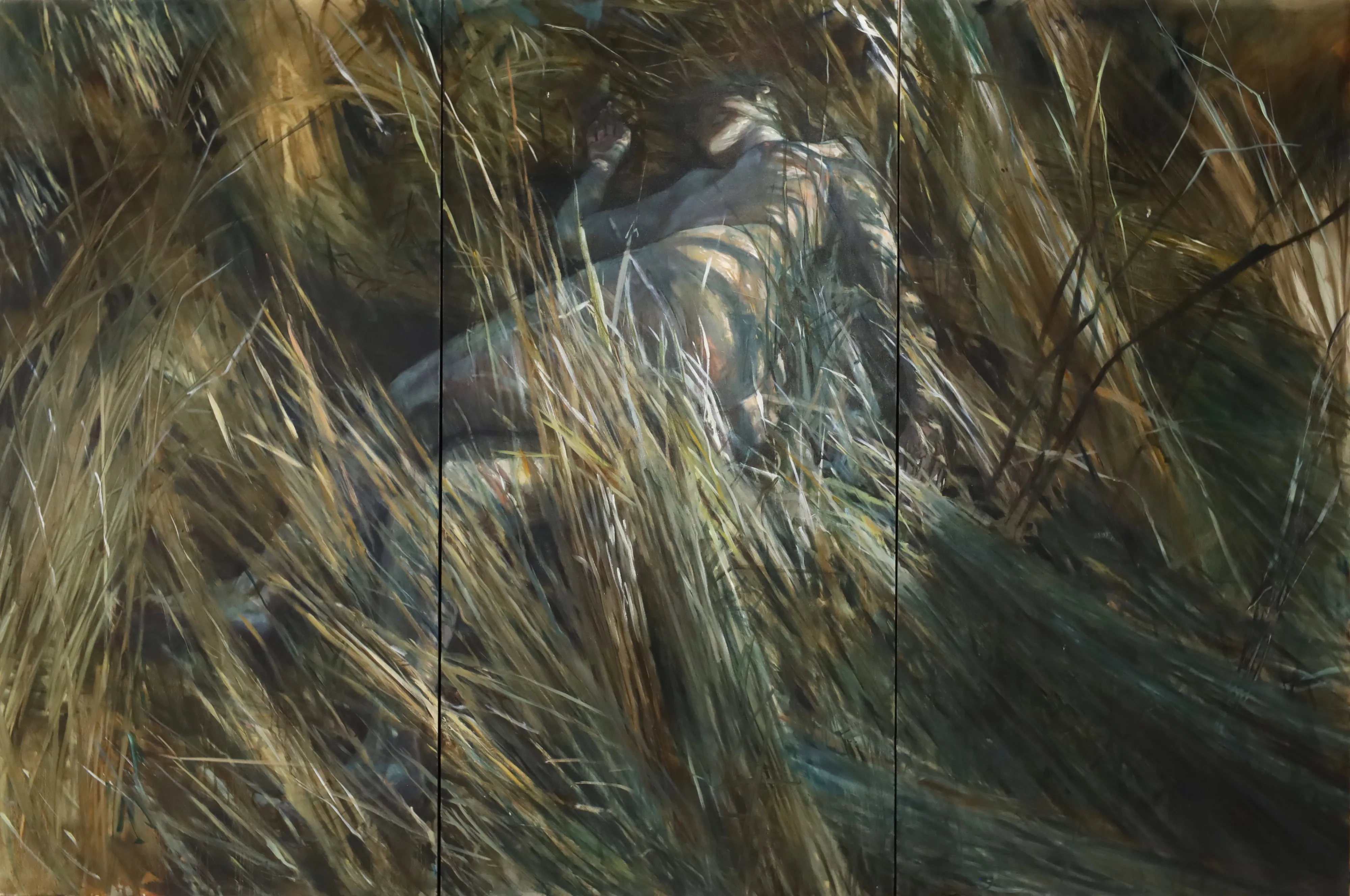 Jane Philips makes “big paintings because I have big feelings.” For the artist, the physical act of painting is a crucial tool to processing and channeling internal and external stimuli that can, at times, be overwhelming. On her canvas and paper surfaces she is able to “scrape, splash, erase, and carve,” building her spaces through repeated additions and subtractions. Grasses and plant-life feature prominently in her imagery, a metaphor for her tangling and twisting emotions and a tribute to the peace she finds in nature, away from the tumult of humanity.